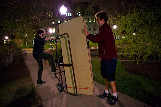 12. Robert drags tables and chairs from Reynolds Club and sets it up on the path that cuts through Botany Pond.